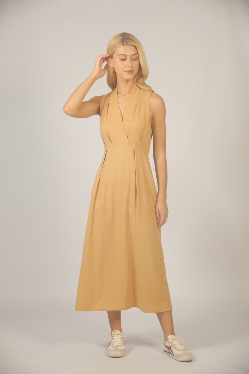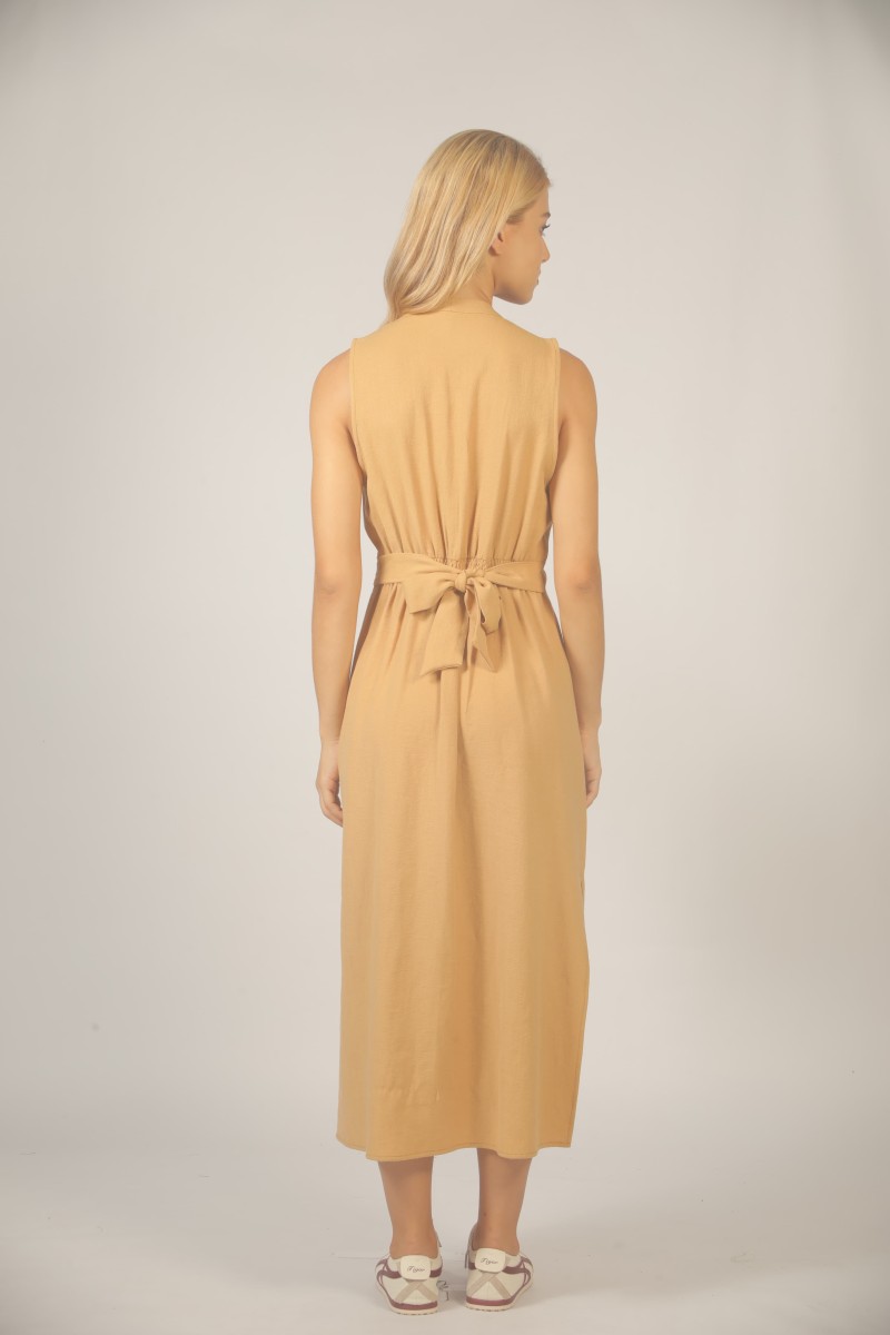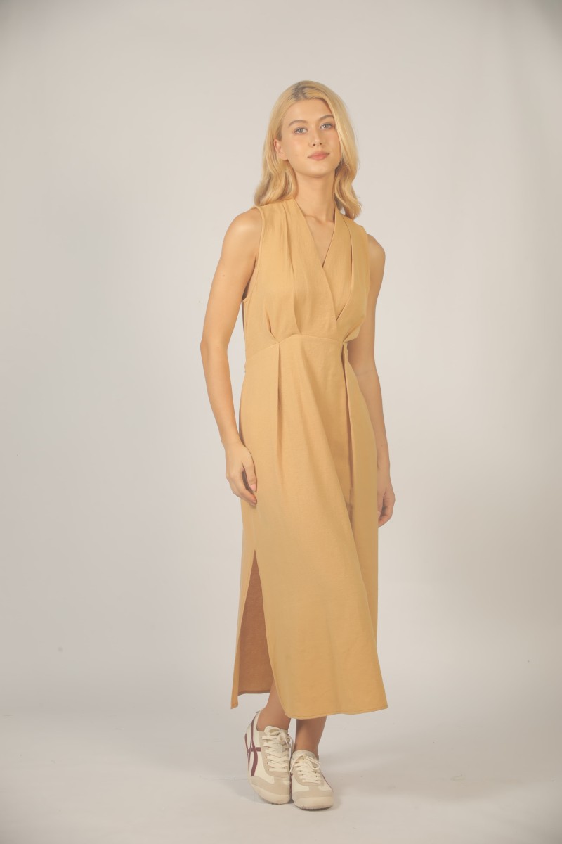 ROBE SANS MANCHE MI MOLLET CROISÉE DEVANT 40%TENCEL 35%VISCOSE 21%TERYLENE 4%LIN